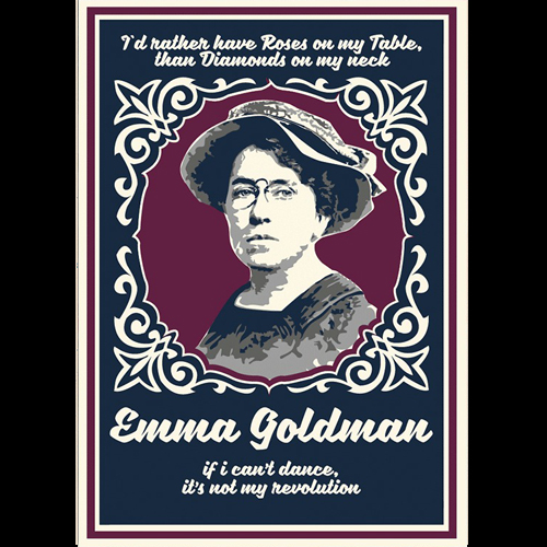 1869 in Russland geboren, wanderte Emma Goldman 1886 nach Amerika aus und wurde dort nach den Justizmorden an den streikenden Anarchisten in Chicago (Kampf um den 8. Stundentag) zur militanten Anarchistin. Von 1906 bis 1917 gab Emma Goldman die anarchistische Zeitschrift „Mother Earth“ heraus und wurde mehrfach inhaftiert. 1919 wurde sie schließlich aus den USA ausgewiesen und nach Russland deportiert, ab 1921 lebte sie in England und Frankreich. Ihr konsequenter Anarchismus, der Einsatz für die “Freie Liebe” und die Rechte der Frauen machten sie zu einer Galionsfigur sowohl der anarchistischen, als auch der feministischen Bewegung.